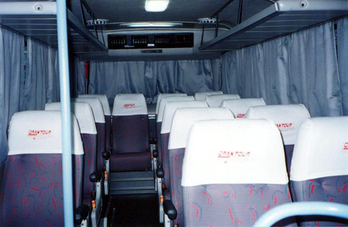 - Marcopolo Volare - Capacidade: 16 lugares – Semi Leito Executivo - Porta Pacotes, Bagageiro; - Microfone, Monitor, Video, CD; - Ar Condicionado digital 80.000 Btus; - Calefação; - Cortinas; - Poltronas Reclináveis em 3 estágios com descansa pés;