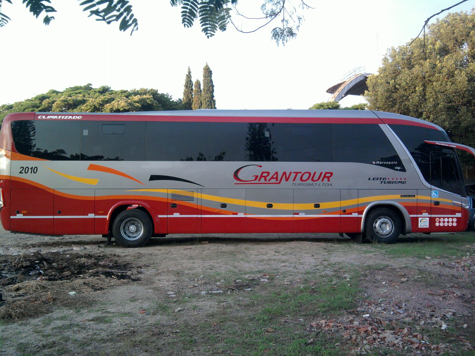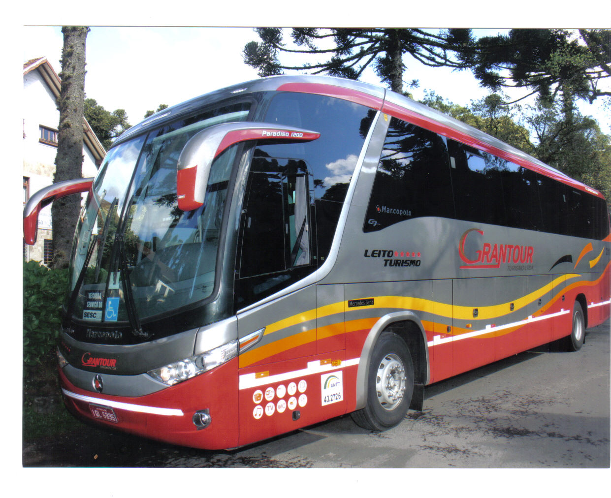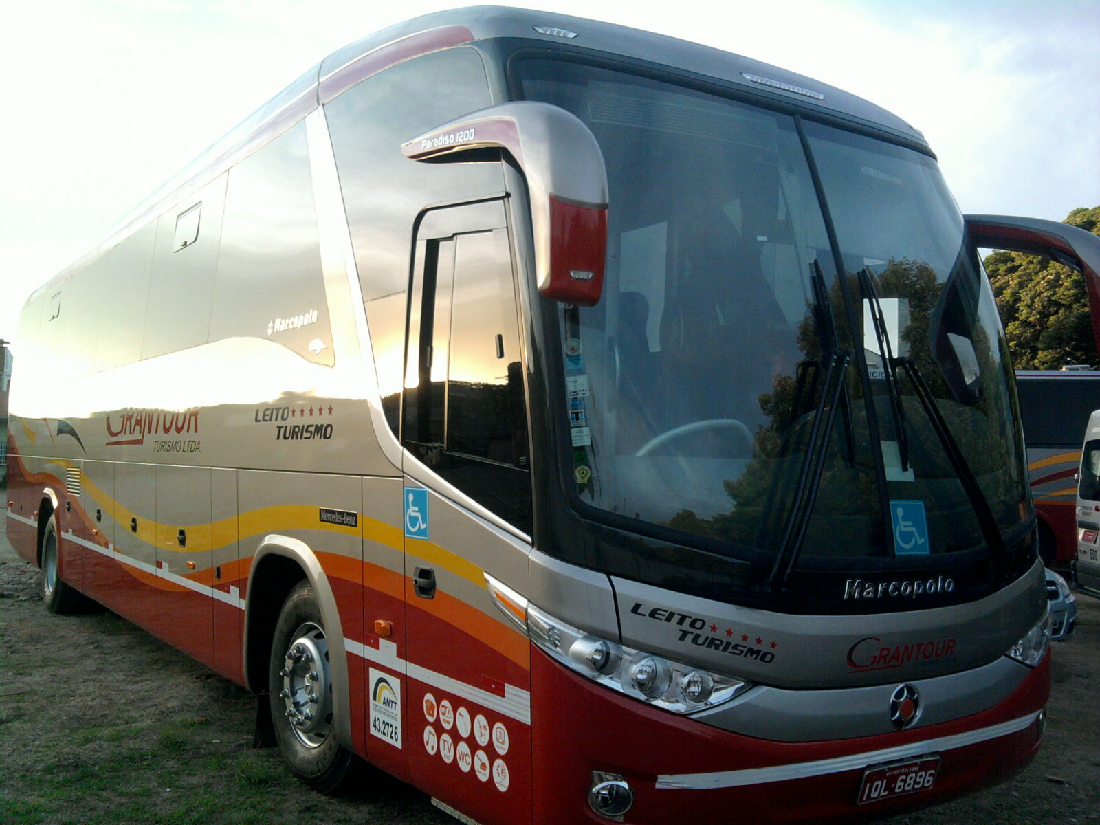 - Marcopolo Paradiso 1200 Geração 7 - Capacidade: 42 lugares – Leito Turismo - Banheiro modelo novo (redondo) com mictório e Porta Pacotes em aço escovado; Porta divisória do salão de correr em vidro; - Frigobar Elétrico, Suqueira, Cafeteira; - Porta copos, Luzes de Leitura em LED e Regulagem de Som, individualizados, Mesa de Jogos (opcional); - Microfone, 4 Monitores LCD, DVD auto play c/ MP3 e USB, CD, tomadas para Notebook e Celulares 110v; - Ar Condicionado Digital 135.000 Btus; - Calefação com Sensores Automáticos; - Vidros colados fumê com cortinas e teto solar envidraçado; - Poltronas Reclináveis em 4 estágios super soft com descansa permas e pés anatômicos; - Suspensão a ar com degrau retrátil para acesso de pessoas idosas e iluminação geral em LED;
